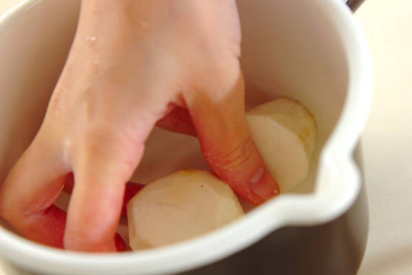 ・里芋(またはエビ芋)は皮をむき、大きい場合は2~4つに切る。塩を加えてかるくもみ、鍋に入れてヒタヒタの水を加えて火にかける。5~6分、竹串がスッと刺さるくらい柔らかく下ゆでし、ザルに上げる。
