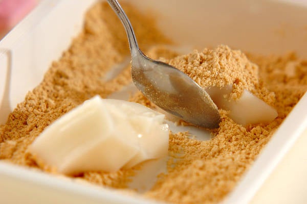 2、バット等にきな粉と砂糖を混ぜ合わせ、(1)から取りだしたお餅をからめる。器に盛り、残ったきな粉をかけ、ゆで小豆を添える。
