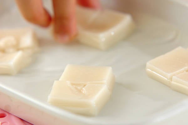 1、お餅を水でぬらし、耐熱皿に重ならないように並べ、ラップをかけて電子レンジで45~60秒位加熱する。柔らかくなったら、お湯につけておく。