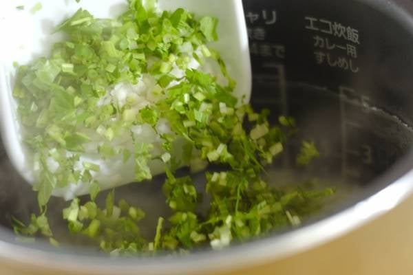 1、炊飯器に水気をきったお米とおかゆの線まで水を加え、おかゆモードのスイッチを入れる。炊き上がったら、七草がゆセットを加えて混ぜ、塩で味を調える。