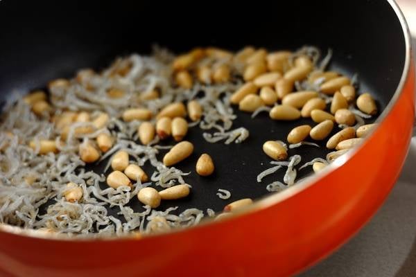 ・<カリカリジャコ>を作る。フライパンにチリメンジャコ、松の実を入れ、中火で焦がさないように乾煎りする。