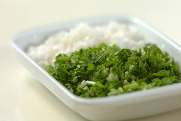 ・お米は水洗いし、30分位水につけておく。七草がゆセット(なずな・はこべら・ごぎょう・せり・すずな・すずしろ・ほとけのざ)は、サッと水洗いして細かく刻む。