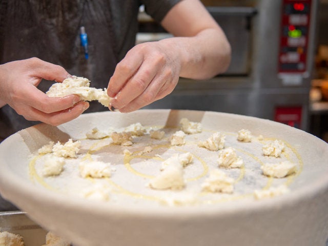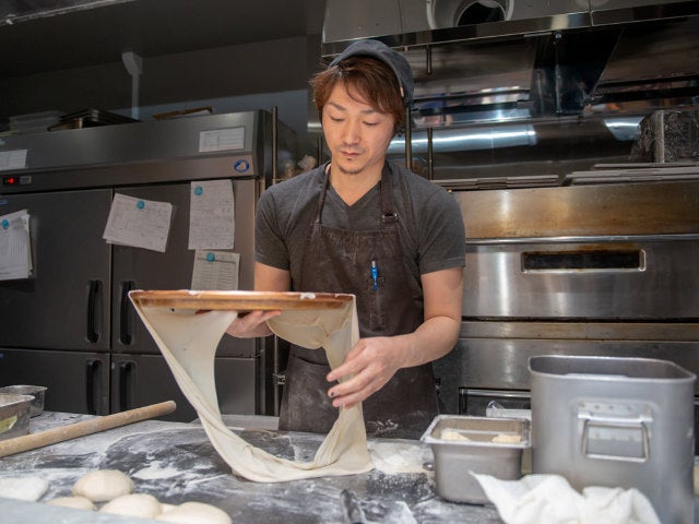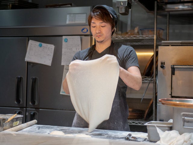 生地は、イースト菌による発酵を行わず、手が透けるほど薄くのばす。日本とイタリアは水質が違い、また気候も異なる。そのため、水を混ぜる量、生地の練り方など試行錯誤を重ねたという。