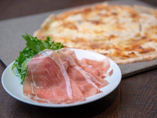 シンプルな料理をさらに楽しむために、24カ月熟成のパルマ産生ハムや野生のルコラ、リグーリア州定番のジェノベーゼといったトッピングやソースもオプションで用意されている。別皿で供されるので、カットされた一切れごとにトッピングやソースを変えて楽しむこともできる。