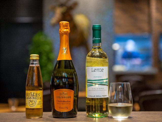 ナチュラルチーズが持ち味の「フォカッチャ・ディ・レッコ」に合うワインとして、優しい味わいを持つ自然派ワインがラインナップされている。グラスワインで供されるのも自然派なのがうれしい。お酒が苦手な人には、ノンアルコールのシードルがおすすめ。キレのいい微炭酸と爽やかな酸味が料理との相性抜群だ。