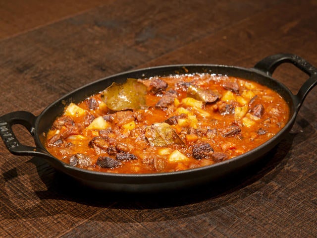 「北海道産エゾ鹿のグーラッシュ」(写真上)。グーラッシュはハンガリー料理として知られているが、南チロル地方でもよく食べられているそうだ。ホロリとなるまでじっくり煮込んだ鹿のバラ肉のうまみとパプリカのスパイシーな味わいがぴったりマッチし、心も体もほっこり温まる一品となっている。