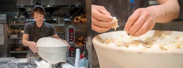 まず、欠かせないのがイタリア・ロンバルディア州名産のフレッシュチーズ「ストラッキーノチーズ」(写真上)だ。ミルキーでほのかな酸味があり、熱するととろ~りとよくのびるのが特徴。日本ではこのチーズの入手が難しいこともあり、これまでなかなか「フォカッチャ・ディ・レッコ」が作られることはなかった。同店ではイタリアから直輸入することで本場の味を実現している。