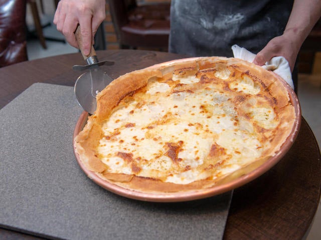 焼き上がった「フォカッチャ・ディ・レッコ」は、チーズのジュウジュウという音と共に銅皿に乗ったままテーブルに現れる。「わぁ!」と歓声の上がる瞬間だ。プレートの上に置かれると、素早くひと口サイズのスクエアにカットされる。
