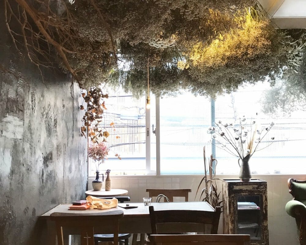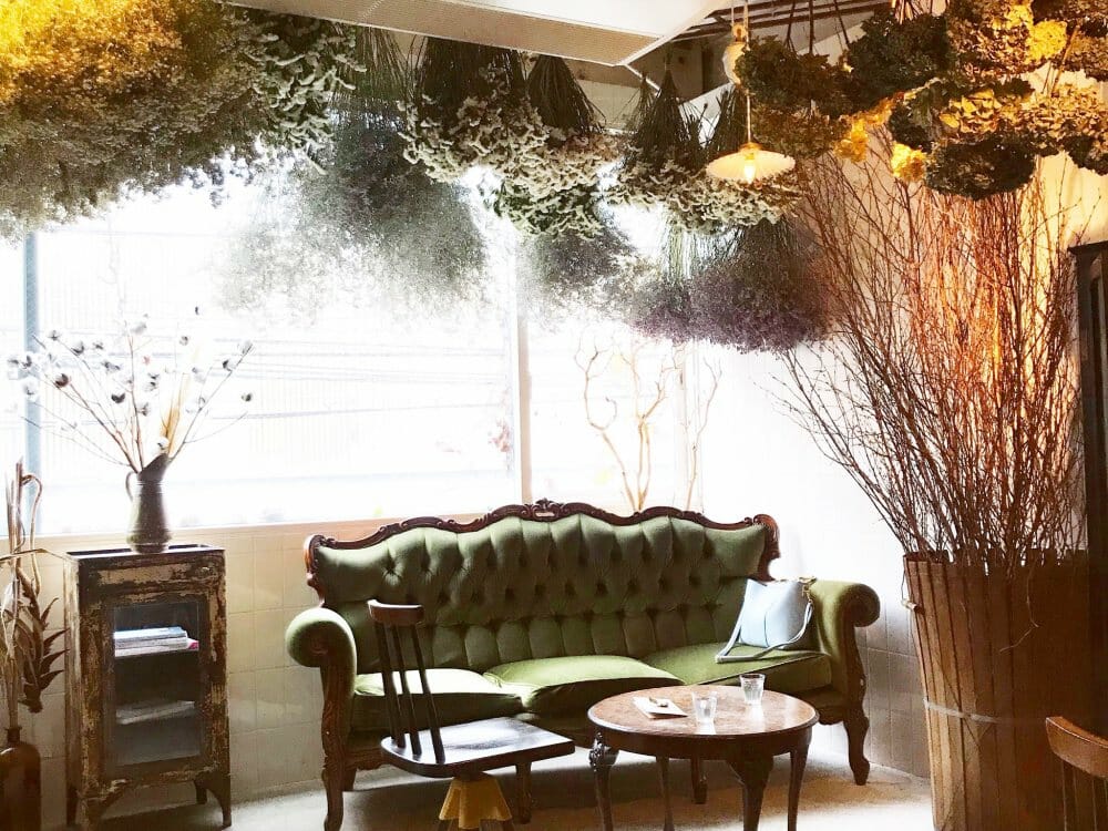京都初のドライフラワー専門店「プルミエ・エタージュ」。ドライフラワーを購入できるのはもちろん、カフェも併設されているので、お花に囲まれながらお茶をすることができる人気スポットです。オープン前からお客さんが数組並んでいて、開店と同時に満席になるほど!