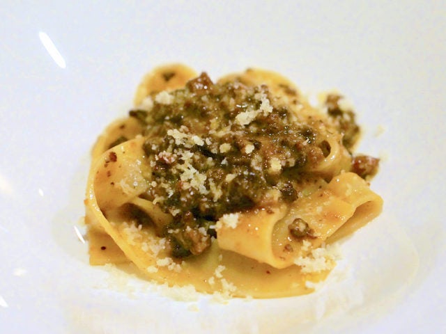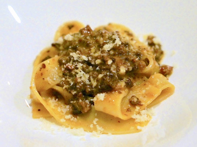 タリアッテレは、喜びに富んで弾む。さらに噛めば、肉の味がじわりじわりとしみ出して、体のうちに眠った野生に火をつける。優美さに満ちながら、肉自身の強靭さもある。ソースとパスタが、まるで生きているかのように、口の中で踊る。