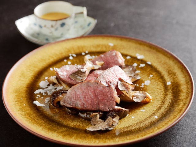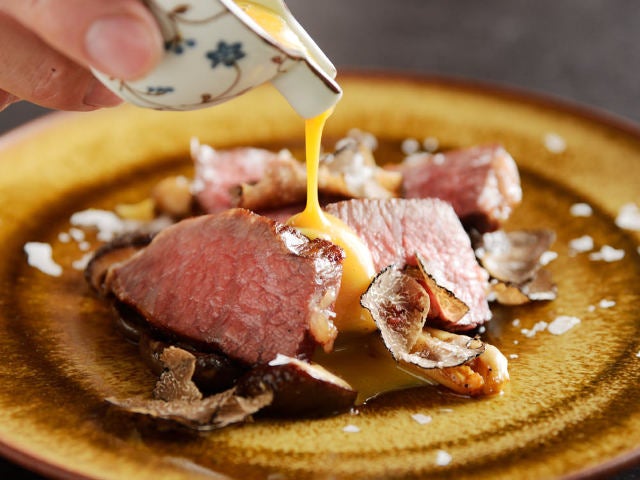 肉料理は「椚座牛の炭火焼 トリュフ卵ソース」(写真上)。温暖な淡路島でストレスを与えず地産地消の飼料で愛情込めて育てられた椚座牛(くぬぎざ牛)が主役。卵黄に焦がしタマネギの風味をつけて、コンソメでのばした卵ソースをかけると…