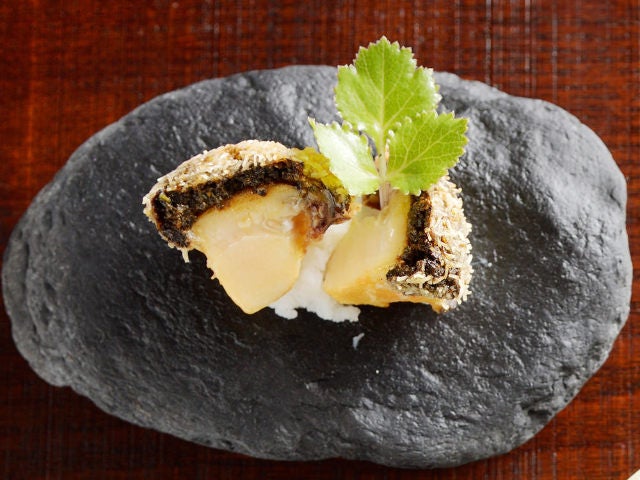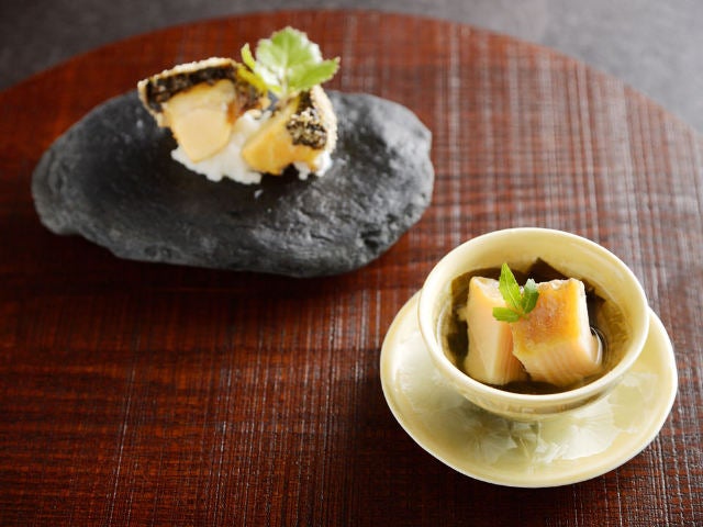 「鮑の肝フリット」(写真上)は、山椒のオイルと鮎の魚醤を合わせたソースで調味した肝に、カダイフをまぶして揚げたもの。ひと口食べるとカリカリとした食感が小気味よく、続いて肝のコク、柔らかな鮑へと変化して、一体感を奏でながら奥深い余韻を残してくれる。