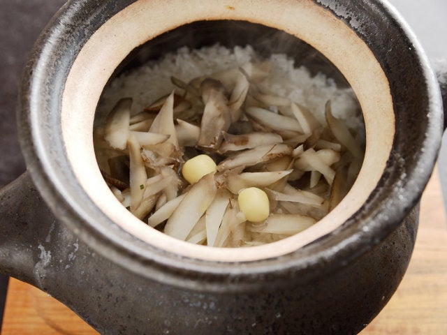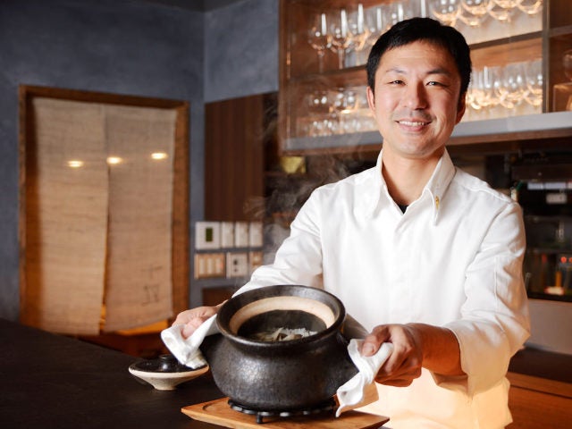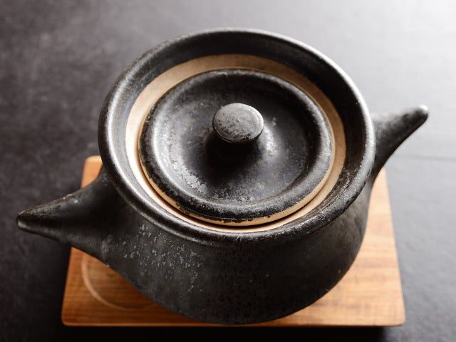 真野シェフの実家から届けられる米は、淡路島の窯元『樂久登窯(らくとがま)』に特注した土鍋で時間をかけて炊きあげられる。