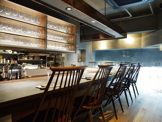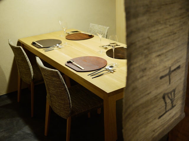 店内は、木、土、和紙…と異素材の組み合わせで表現した、スタリッシュな和モダン空間。オープンキッチンのカウンター席に座ると、間近に見えるシェフの手さばきや食欲をそそる香りに料理への期待が高まる。