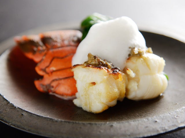 こちらは「伊勢海老の味噌幽庵(ゆうあん)焼き」(写真上)。プリプリとした弾力と濃厚な甘さが醍醐味の伊勢海老に、白あら味噌のマイルドさと、伊勢海老の味噌の濃厚さが加わりとても美味。