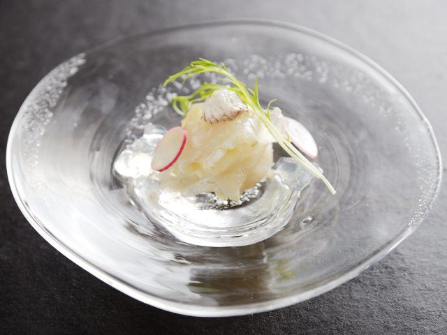 フグのヒレを使ったヒレ酒のジュレと相まって、トラフグの醍醐味を存分に堪能できる一皿となっている。