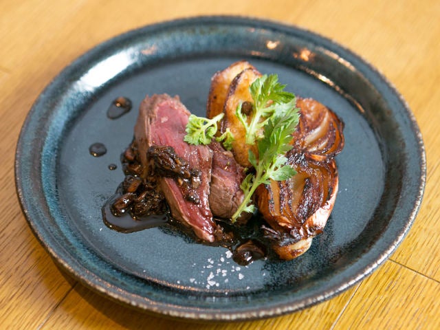 しっかりお腹を満たしたいときにおすすめは、ローストしたジャガイモ、赤イモ、タマネギが添えられた「蝦夷鹿ランプのロティ」(写真上)はいかが? 繊細で柔らかな肉質でありながら力強さを感じる赤身肉は、臭みがなくしっとりジューシー。シェアはもちろん、ひとりでもぺろりと平らげられる。