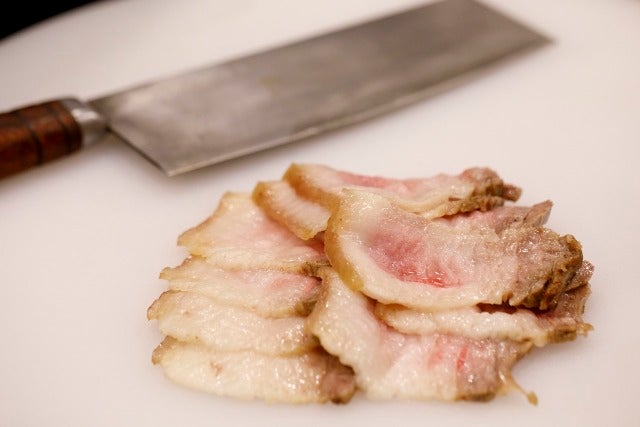 濃厚な赤身だけでなく良質な脂をもつハンガリーのマンガリッツァ豚は飼育管理制度が制定されておりハンガリー国内でも希少で国宝とされている。その純血マンガリッツァ豚を生体輸入し4年かけて純血国産マンガリッツァ豚としてやっと出荷するに至ったこの十勝のマンガリッツァ豚は、中国料理で使うどころか手に入れることすら困難である。「1頭に18カ月かけて飼育しているんです。だから脂がきれいでしょう? 初めて食べた時にこの脂を食べさせたいと思ったのです」と菰田さん。