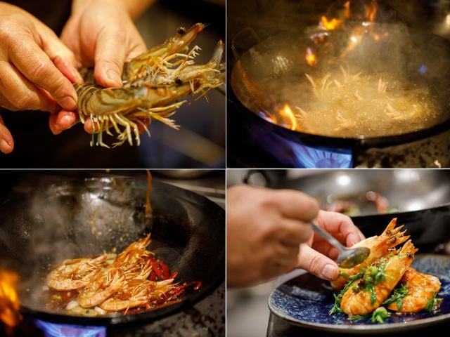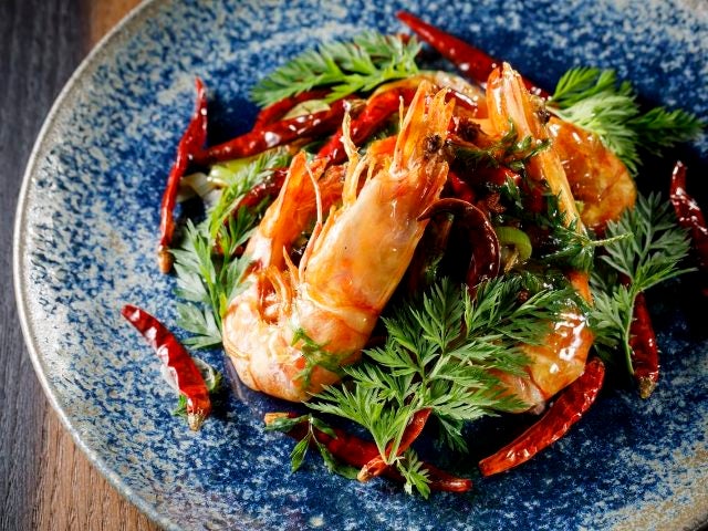 次は「活車海老(いきくるまえび)の高温揚げ 満天星唐辛子と花椒のピリ辛炒め」。この唐辛子の量から想像するとかなりの辛さだが、それを感じさせないのが車エビの存在。生きたまま高温でほんの数秒揚げた車エビは頭からガブリといくと殻は薄皮のようにやわらかく、それでいて天ぷらのようにサクサク。信じがたい食感だ。甲殻類特有の香りとエビ味噌のコクに身も心も骨抜きになる。