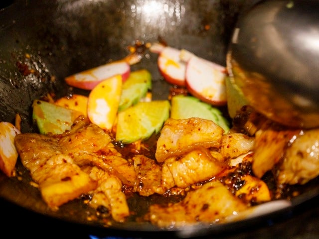 確かに見た目ではかなり脂があるが、脂っぽさを微塵も感じない。その秘策を訊くと塊肉を茹でただけというからびっくりだ。度肝を抜かれたのはその調理法でキャベツや甘辛い甜麺醤(テンメンジャン)は使わない。四川では茹でた豚の塊肉をカットして葉ニンニクと炒め豆板醤などで味付けするのである。