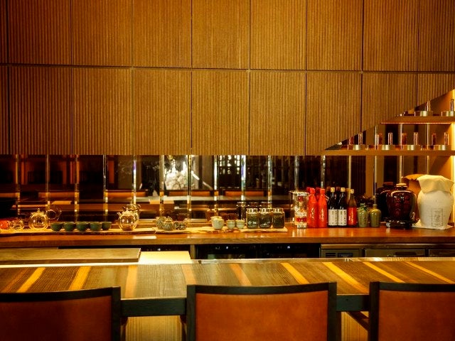 中国料理店らしい雰囲気の中に和を感じる盆栽を配し、木の温もりに溢れる内装やゆったりと座れる椅子は非常に落ち着く。この空間はまさに菰田さんの料理を表現していると言える。