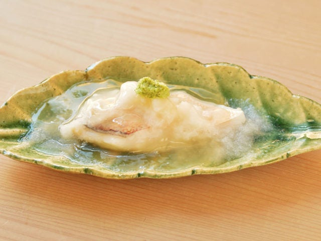 酒蒸ししたぐぢの上に、すりおろしたカブがたっぷりと添えられていて、食べた瞬間にカブの甘みが口いっぱいに広がる。ふっくらやわらかなぐぢの上品な甘みとの相乗効果で、なんとも幸せな気持ちにさせてくれる。