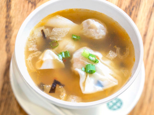 ヘルズキッチン店のみで出しているメニューは2品あり、そのうちの1つは「ホット&サワー・ワンタンスープ」(写真下)。酸っぱいだけでなく、辛みもしっかり効いている。ワンタンの中身は豚挽き肉とエビ。とろみのあるスープは、ニューヨークの寒い冬にはうってつけだ。