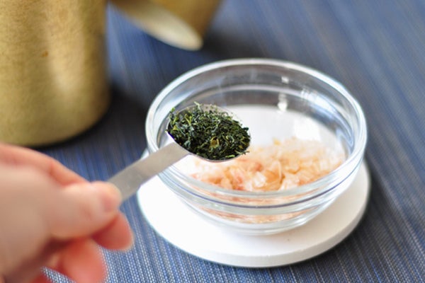 茶葉そのものは苦みがありますが、鰹節や小エビ(桜エビ)、ごまなど、うまみの強い食材と合わせると気にならなくなり、ごはんに合うふりかけに!