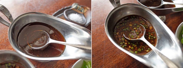 石垣の塩、アッシェ(みじん切り)したタマネギ、山わさび、和マスタードなどを混ぜ合わせた「山わさびのソース」(写真上・左)、みりんや酒、長ネギなどを漬け込んだ「長ネギのソース」(同・右)などをかけ、味を変えながら食べるのが『パポイヤ』流だ。
