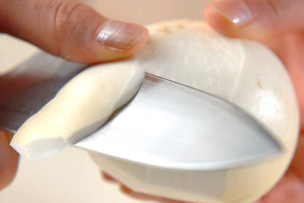 1、カブは葉がついている場合は葉を切り落とし、皮を厚めにむき、縦半分に切って1個を8つのくし切りにする。カブの葉は水洗いして水気をきり、長さ4cmに切る。<調味料>の材料は合わせておく。