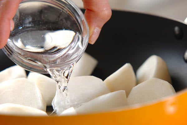 2、フライパンにカブ、あったらカブの葉、水を入れて蓋をする。中火にかけて蒸し煮し、途中で水分がなくなってきたら分量外の水を少量加え、柔らかくなるまで加熱する。