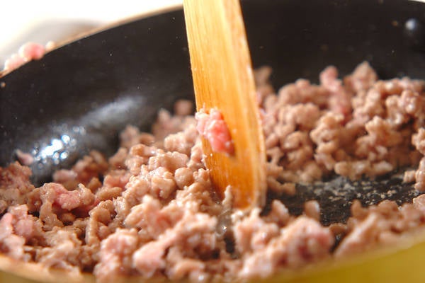 3、別のフライパンにオリーブ油を入れて熱し、豚ひき肉を炒める。肉の色が変わったら<調味料>を加えて炒め合わせる。