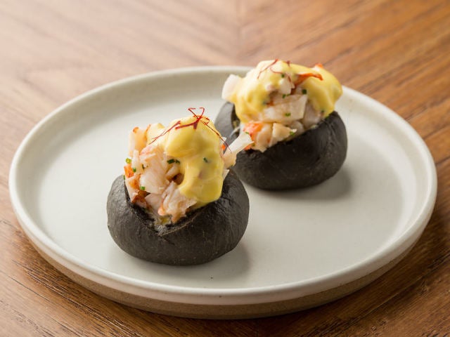 こちらは竹炭を練り込んだブリオッシュに、ロブスターカクテルが詰まった「自家製竹炭パンのロブスターロール」(写真上)。ロブスターを素材に使用した料理は、シェフのシグネチャーの1つ。竹炭を練りこんだパンのアイデアもまたシグネチャーで、人気が高い。タパス料理はどれもナイフ&フォークは不要。気取らずに、Eat by handでいこうではないか。
