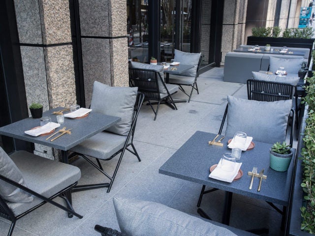 丸の内のメインストリートとも言える仲通りに面して入口があり、ソファがあるメインダイニング50席(写真上)、テラス20席(写真下)、そしてバーカウンターからなる表情豊かな店内は、広々として心地良い。どの席も座ったとたんに動きたくなくなるほどだ。
