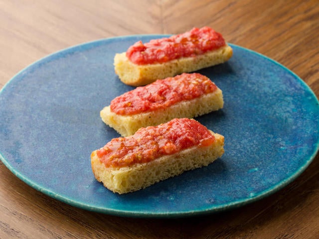 まずはスターターにふさわしいタパス料理から。トマトの味が濃厚な「パンコントマテ」(写真上)で空腹を落ち着かせよう。素朴なパン、チャバタの上に、シーズニングをきかせたすりおろしトマトをたっぷりトッピングしたシンプルな一品。