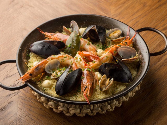 食事の仕上げには、スペイン料理の定番「クラシックシーフードパエリア」(写真上)がおすすめだ。焼きたてが登場する瞬間は、テーブルが最高に盛り上がり、華やぐだろう。生米から炊き始めるので、時間に余裕を持ってオーダーしておこう。具沢山の下には、香り高いサフランライスがたっぷり。アルデンテのパエリアをつまみに、ワインをさらにもう1本となるかも⁉︎