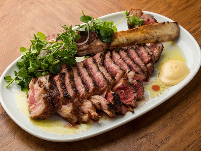 メインはガッツリ「肉料理」をシェアしよう! メインの「骨付きリブアイステーキ」(写真上)は、焼き上がりまで40分。骨つきで1kgもあり、3~4人でシェアするのにちょうどいいサイズ。塩・胡椒のシンプルな調味に、ニンニクと酸味が特徴のチミチュリソースで仕上げたボリュームのあるひと皿だ。