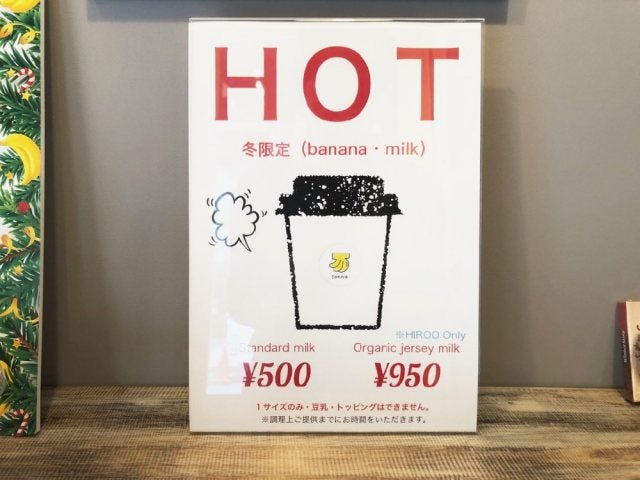 冬の間はホットメニューもあります。バナナは食物繊維が豊富でお通じがよくなる効果もあるので、女性にはうれしいですね。