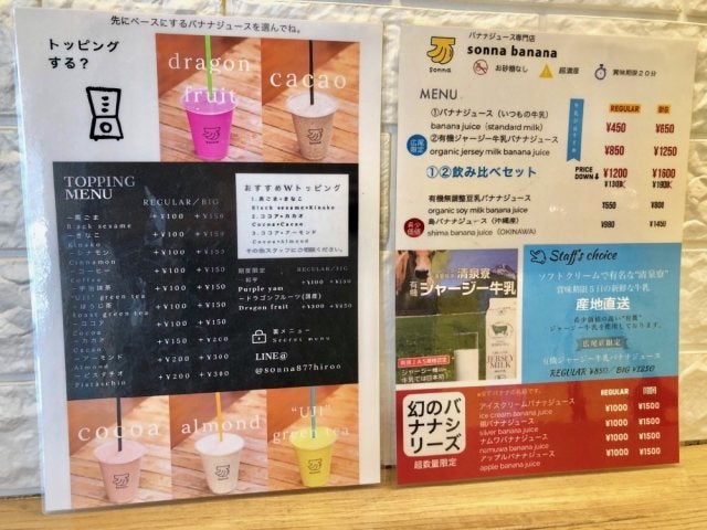 メニューの中でもひと際目を引くのが、この鮮やかなピンクのパッションフルーツのバナナジュース。ベースのバナナジュースにトッピングするものを選べるのもうれしいところ。他にも、旬なフルーツや、カカオ、黒ごま、ほうじ茶…とたくさんのメニューの中から選べます。
