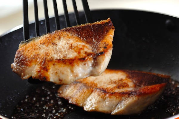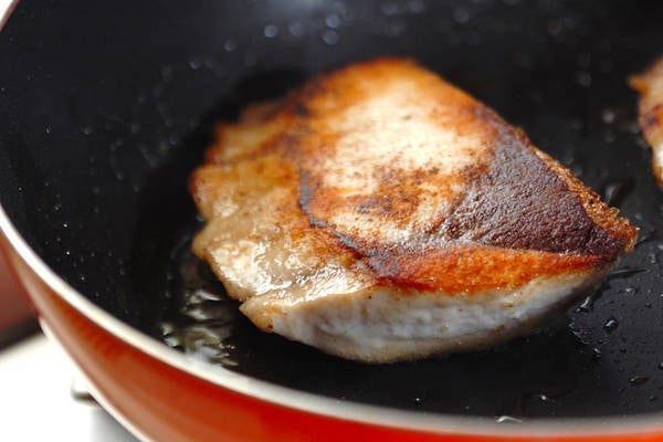 2、フライパンにバター、残りのサラダ油を中火で熱し、ブリを両面色よく焼き、いったん取り出しておく。