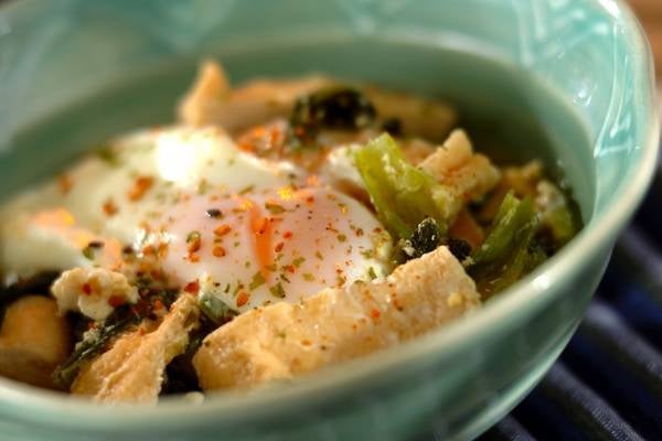 下ごしらえをしておけば、10分でできるスピードレシピ。半熟の黄身を、だしの染みた油揚げと小松菜にからめていただきます。七味のピリッとした辛さがアクセントになったおいしさを楽しめますよ。