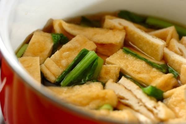 ・小松菜は根元を切り落とし、長さ3cmに切る。油揚げは熱湯にサッと通し、短冊切りにする。