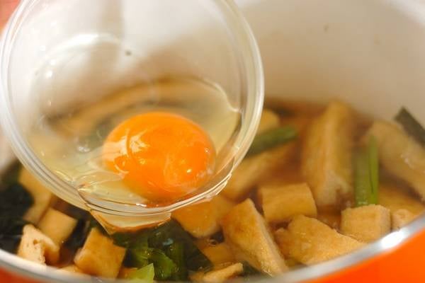 2、小さいボウルに卵を割り、鍋の中にそっと落とし入れる。蓋をして、卵白がかたまってきたら火を止めて器によそう。七味唐辛子を振る。
