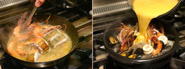 注文を受けてから、シェフが食材一つひとつのベストなタイミングを見極め、具材ごとに炒めていく。これだけでも充分おいしそうだが、半日かけて作った魚介だしをさらに加えていく。