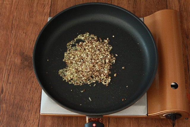 ①ニンニク、タマネギはみじん切りする。②フライパンにオリーブオイル、ニンニク、タマネギ、赤唐辛子を入れて中火で熱し、ニンニクの香りが立つまで炒める。