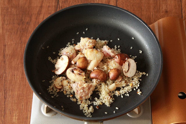③ズッキーニ、タラの切り身、米を加えて米が透き通るまで炒める。