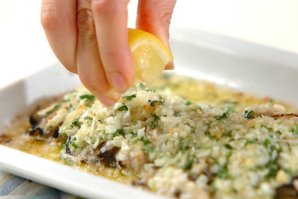 4、レモンを搾ってバゲットにのせ、お好みで分量外のコショウを振る。