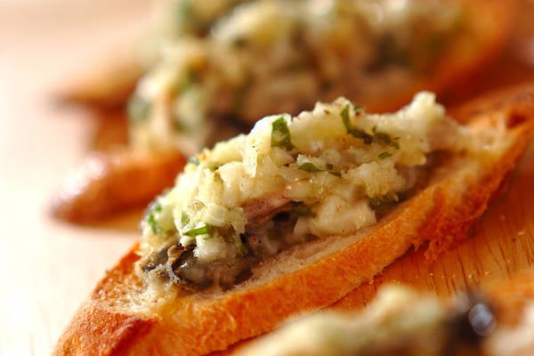 今回はガーリックの香りが食欲をそそる、ワインにもぴったりな一品をご紹介します。カリカリに焼いたバゲットにのせてブルスケッタ風に盛り付ければ、オシャレなおつまみになりますよ。
