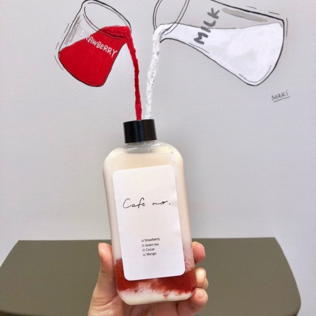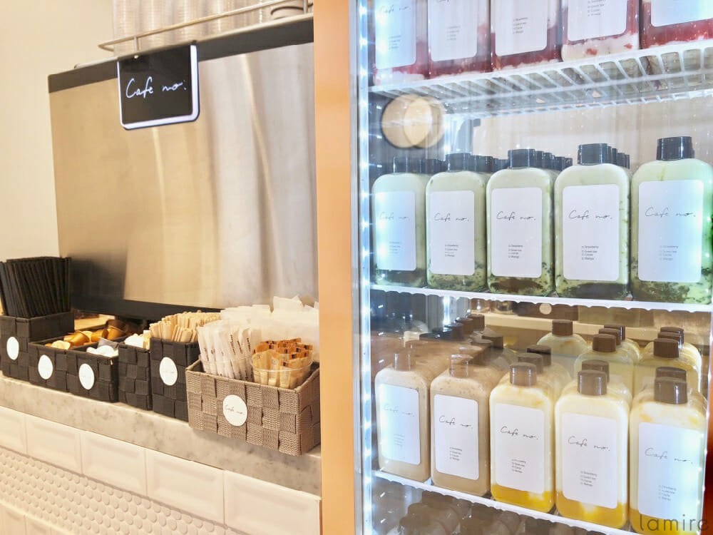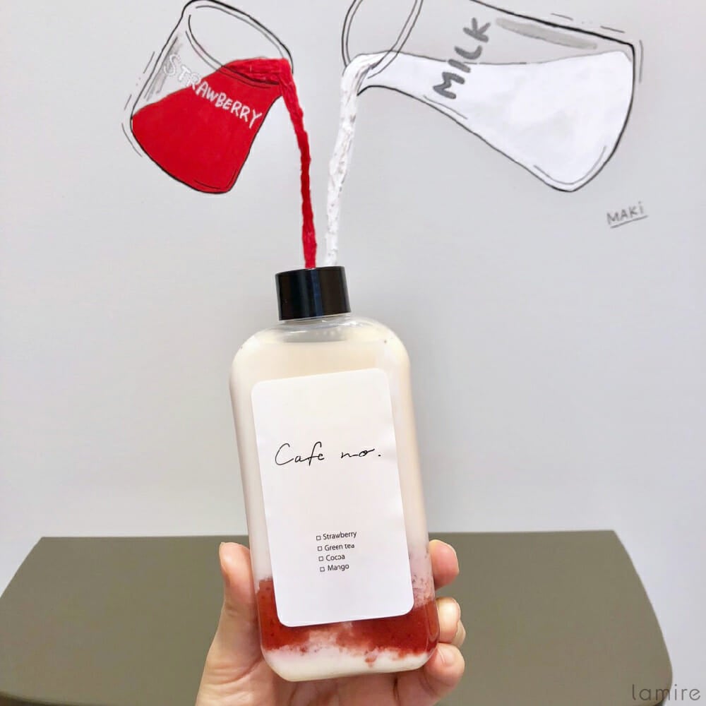 「cafe no.」といえば、このボトルドリンクが大人気!ミルクとフルーツの組み合わせや、チョコレートや抹茶との組み合わせもあります。とにかく見た目がすべてかわいくて選ぶのが大変!