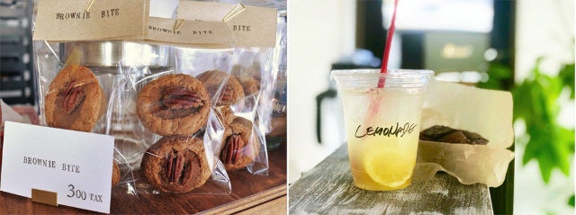 ブラウニーのお供にオーダーしたいドリンクには、コーヒーや紅茶をはじめ、自家製のレモネードやジンジャーエールも揃う。はちみつ入りの「オリジナルレモネード」(同・右)は、レモンがたっぷり入って後味もさっぱり。